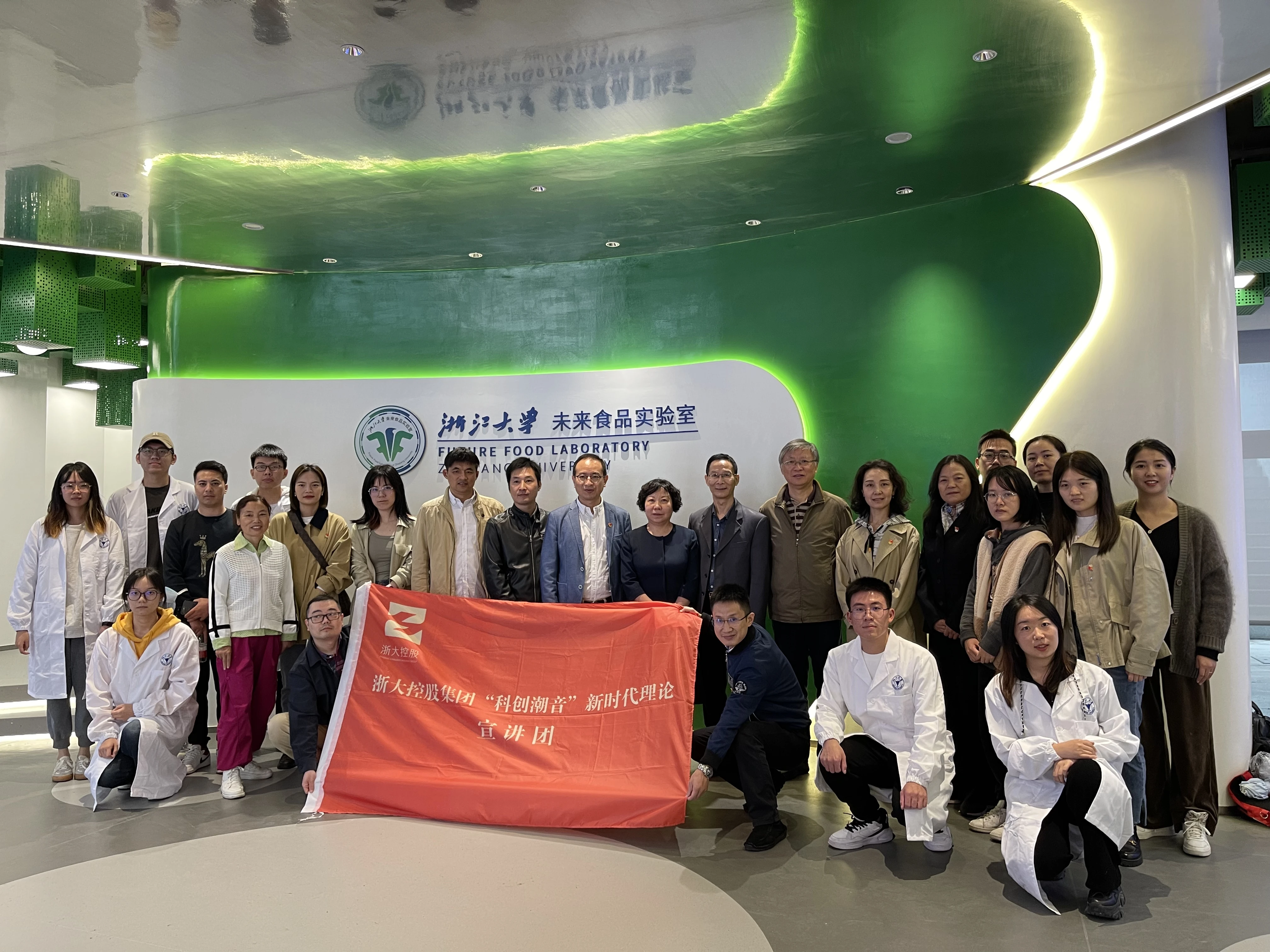 在充满科技感的未来食品实验室内,集团“科创潮音”新时代理论宣讲团成员、浙大创新院青年党员夏明非作了题为“立足自立自强和高水平创新”的宣讲。他以答好高水平科技自立自强“时代考题”为主线,通过数据与图表展示了最近几十年来中国在科技领域的伟大成就,并结合浙江省“两个先行”目标、杭州市建设“国际科学中心”及集团高能级科创平台整体规划,以小切口讲述大时代,为大家宣讲了党的二十大举旗定向的伟大历史意义。