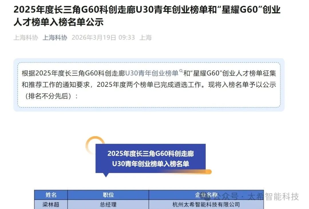 近日,2025年度长三角G60科创走廊U30青年创业榜单和“星耀G60”创业人才榜单入榜名单正式公示,浙大创新院投后企业杭州太希智能科技有限公司总经理梁林超入选U30青年创业榜单!