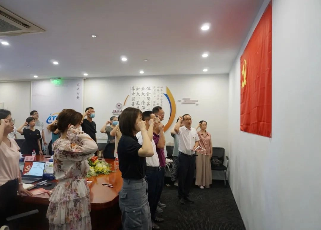 与会的党员同志们通过观看习近平总书记《在庆祝香港回归祖国二十五周年大会暨香港特别行政区第六届政府就职典礼上的讲话》《袁家军在浙江大学宣讲第十五次党代表精神》等教育视频,共同学习了近期的重要讲话精神和会议精神,共创同学齐进步气氛热烈,并为七月入党的党员同志们发放了政治生日贺卡。全体党员面向党旗,再次庄严宣誓,重温入党誓词。